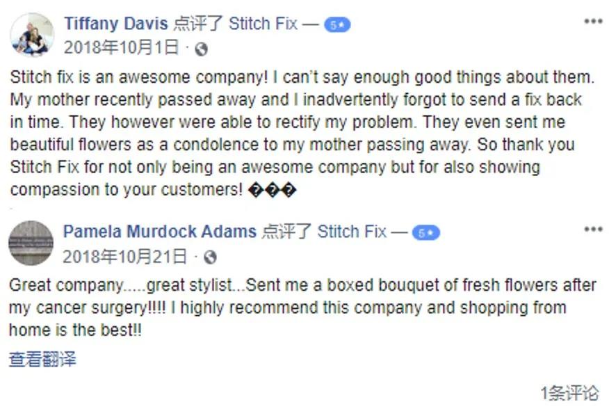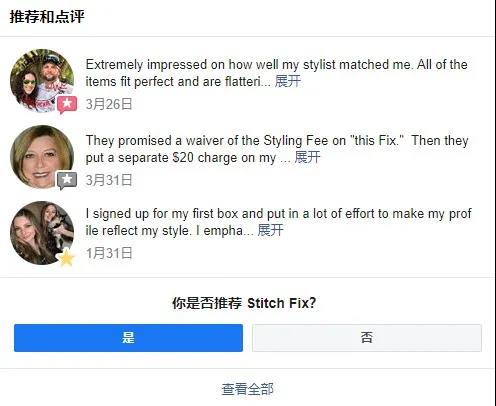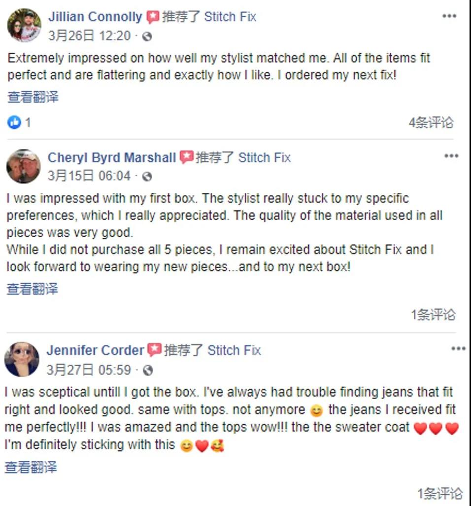 以Facebook为例,如果用户身边朋友有发布有关内容,基于Facebook算法,很大程度上你会收到相关推荐;另外,如果用户主动搜索进入Stitch Fix会看到以下这个好评推荐,吸引用户继续浏览相关信息。