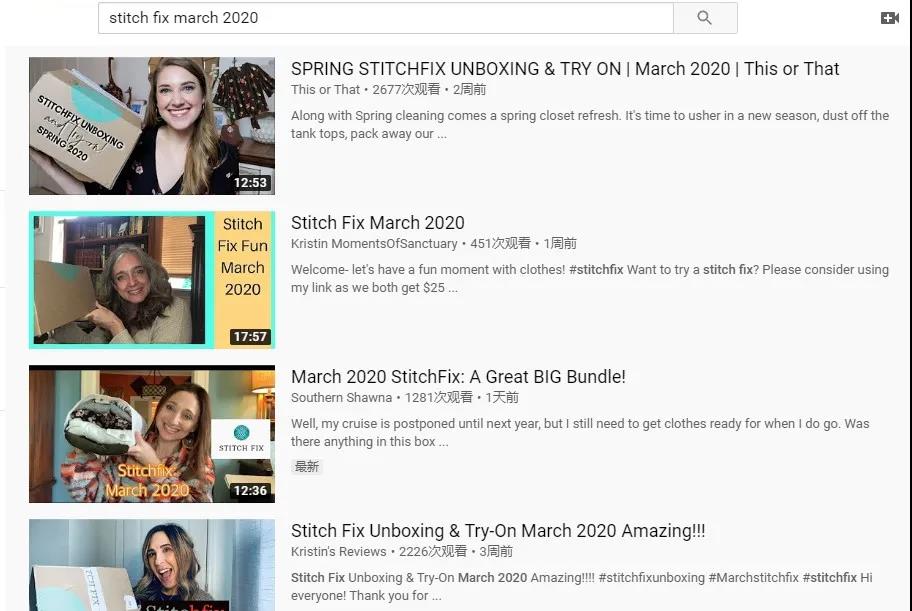 在YouTube上可以看到关于Stitch Fix的话题,均是用户主动分享"开箱体验",获得不少网友的点击量和互动。通过用户以开箱体验,高级盲盒的玩法,也提升了围观消费者的好奇指数,提升订购量。