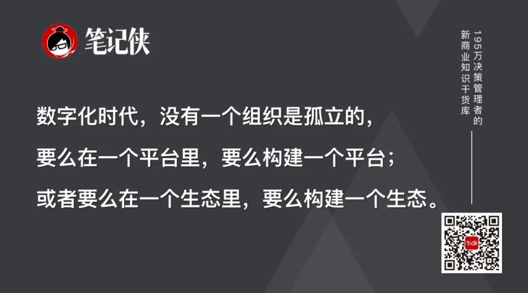 数字化时代,没有一个组织是孤立的,要么在一个平台里,要么构建一个平台;或者要么在一个生态里,要么构建一个生态。