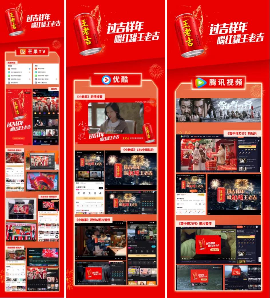 在吉文化的加持下,王老吉携手了国内主要的影视综艺平台腾讯视频、爱奇艺、优酷、芒果TV,锁定了《雪中悍刀行》、《小敏家》、《风起洛阳》等诸多近期热播大剧,进行了创意的植入,将姓氏图腾罐的内涵与头部IP的节目内容、会员可见广告巧妙捆绑。这些内容植入既是品牌想要传达给消费者的重点,同时也与节目的情景完美契合,从而既保证最大化地触及广泛的年轻群体实现王老吉品牌的曝光,又做到了润物细无声般地将定制罐的理念植入消费者的脑中。
