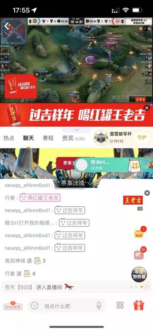 而对于游戏圈层,王老吉则加码虎牙直播,独家冠名《战神杯》、特约赞助《雷霆破军杯》等赛事的比赛直播,将吉运Buff与赛事内容深度结合,通过场景演绎和互动来实现深化与用户之间的联系。