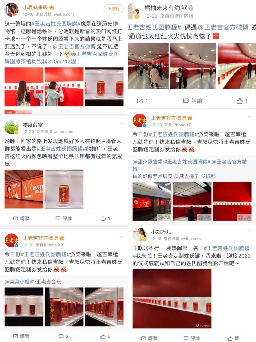 这一切,源于王老吉在投放地铁广告时运用了线上广告的互动思维,在社交媒体上发起了晒合影抽奖的活动,吸引了用户产出大量的UGC内容,全面制造出了一种沉浸式的春节氛围感和浓浓的年味。