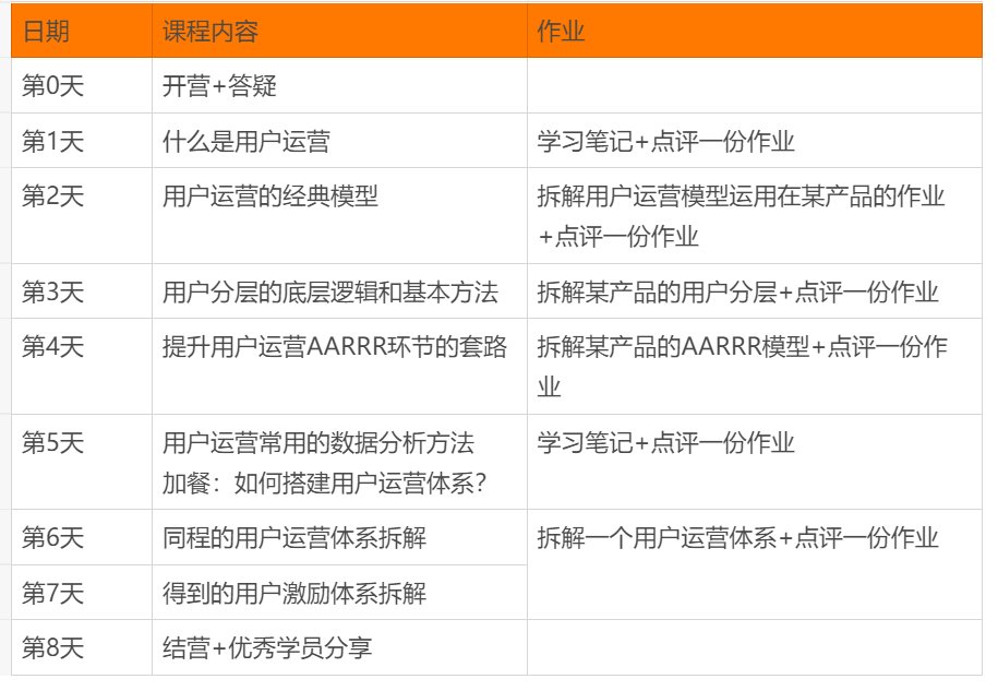 通过搜索一系列用户运营的内容以及结合自己在做用户运营的过程中,哪些知识对于自己来说是非常重要的,所以最终将用户运营案例拆解营的内容梳理成了以下课程表: