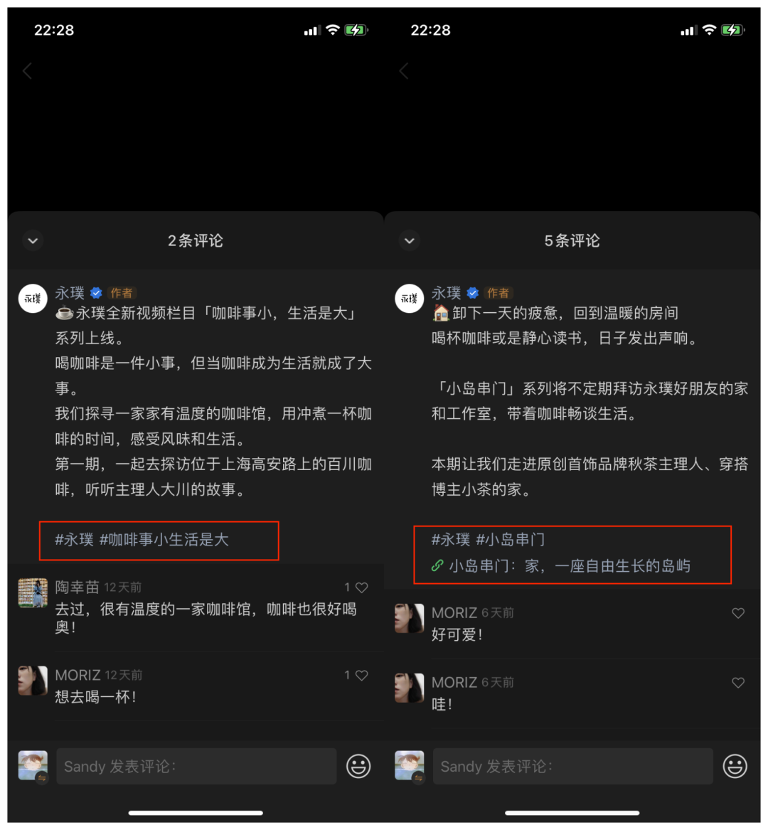 比如:#咖啡事小生活是大:去探访不同咖啡馆以及背后主理人的故事;#小岛串门:采访与永璞品牌调性相符“追求有意思慢慢来”生活态度的核心粉丝;