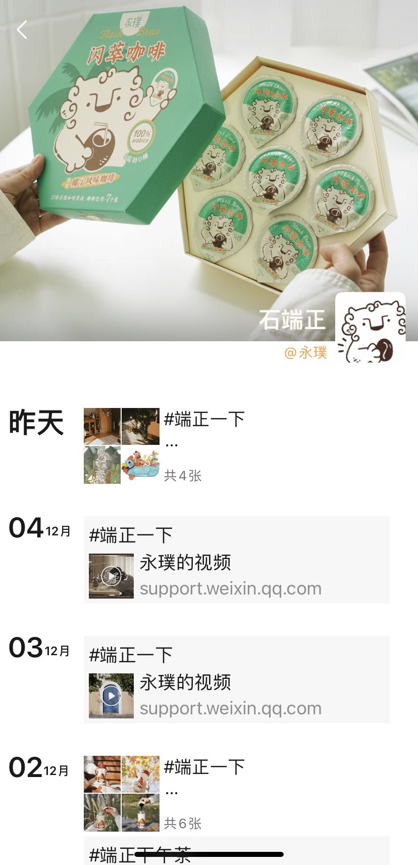 头像为石端正的IP动画形象,风格卡通可爱;封面为永璞的精粹咖啡产品开箱图,色调偏暖。