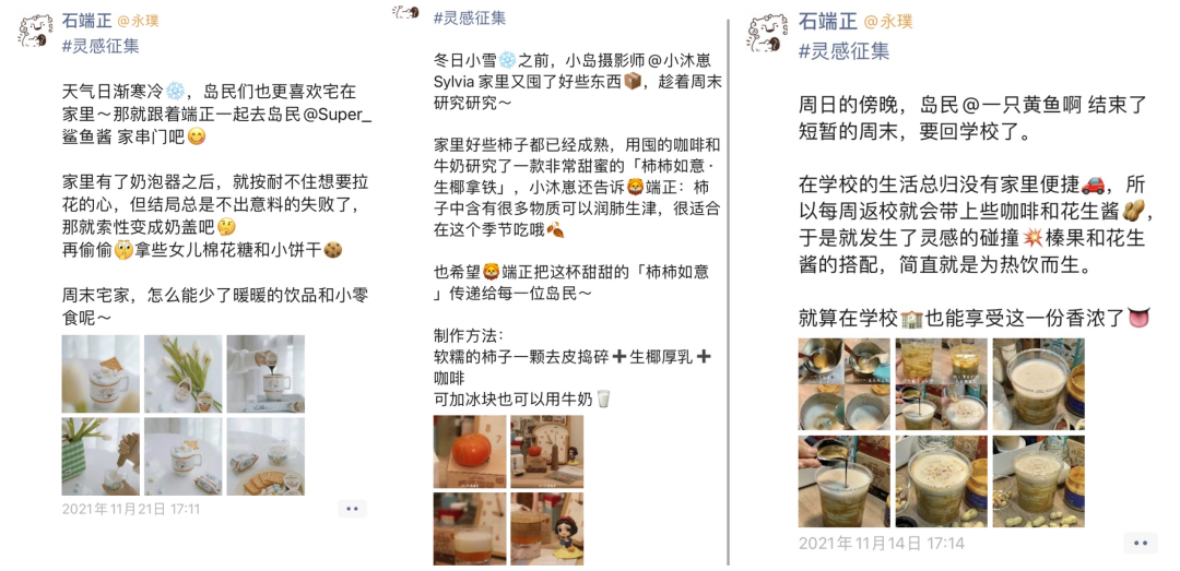 以#灵感征集为tag,此类内容关注不同的永璞岛民会如何“花式制作”不同类型的咖啡,如下图所示。同时在此类内容下,文字专门点出岛民的具体名字、职业以及生活状态。