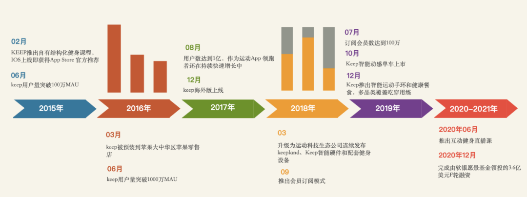 keep在2015年2月上线,在一个月内相继完成了天使轮融资和A轮融资,2个月内完成A+轮融资,2016年5月完成3200万美元C轮融资,同年8月又获得腾讯1300万美元C+轮战略投资。2018年7月,完成1.27亿美元D轮融资,2020年5月完成8000万美元E轮融资,估值超过10亿美元,2021年一月KEEP再次完成了3.6亿美元F轮融资,目前估值超过20亿美元。
