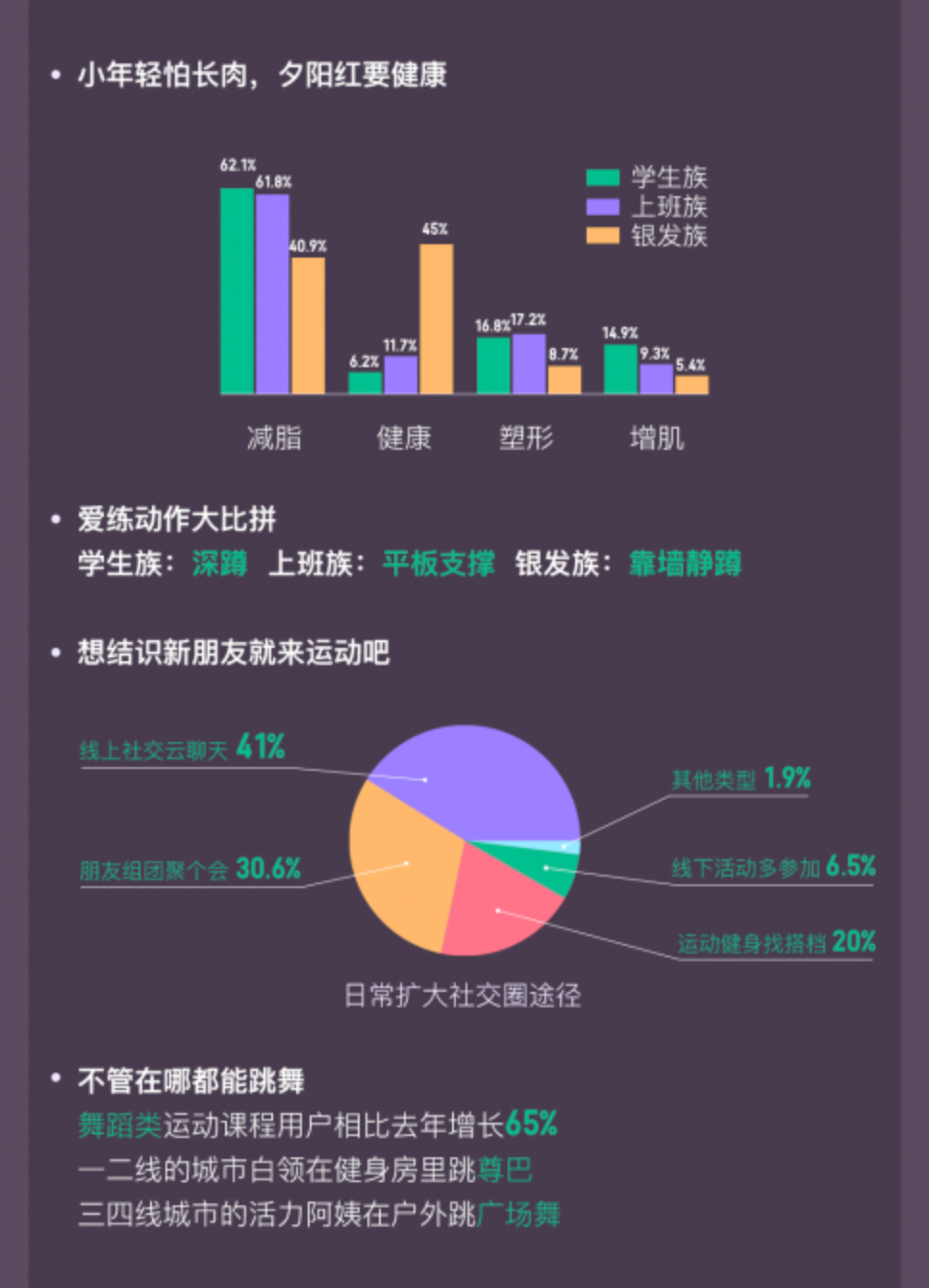 年轻人注重减脂,在乎身形的改变,跳舞运动相比去年,增加65%(因现在小视频的兴起,抖音、快手、视频号)从前有门槛的艺术技艺,在互联网时代更容易学习了。