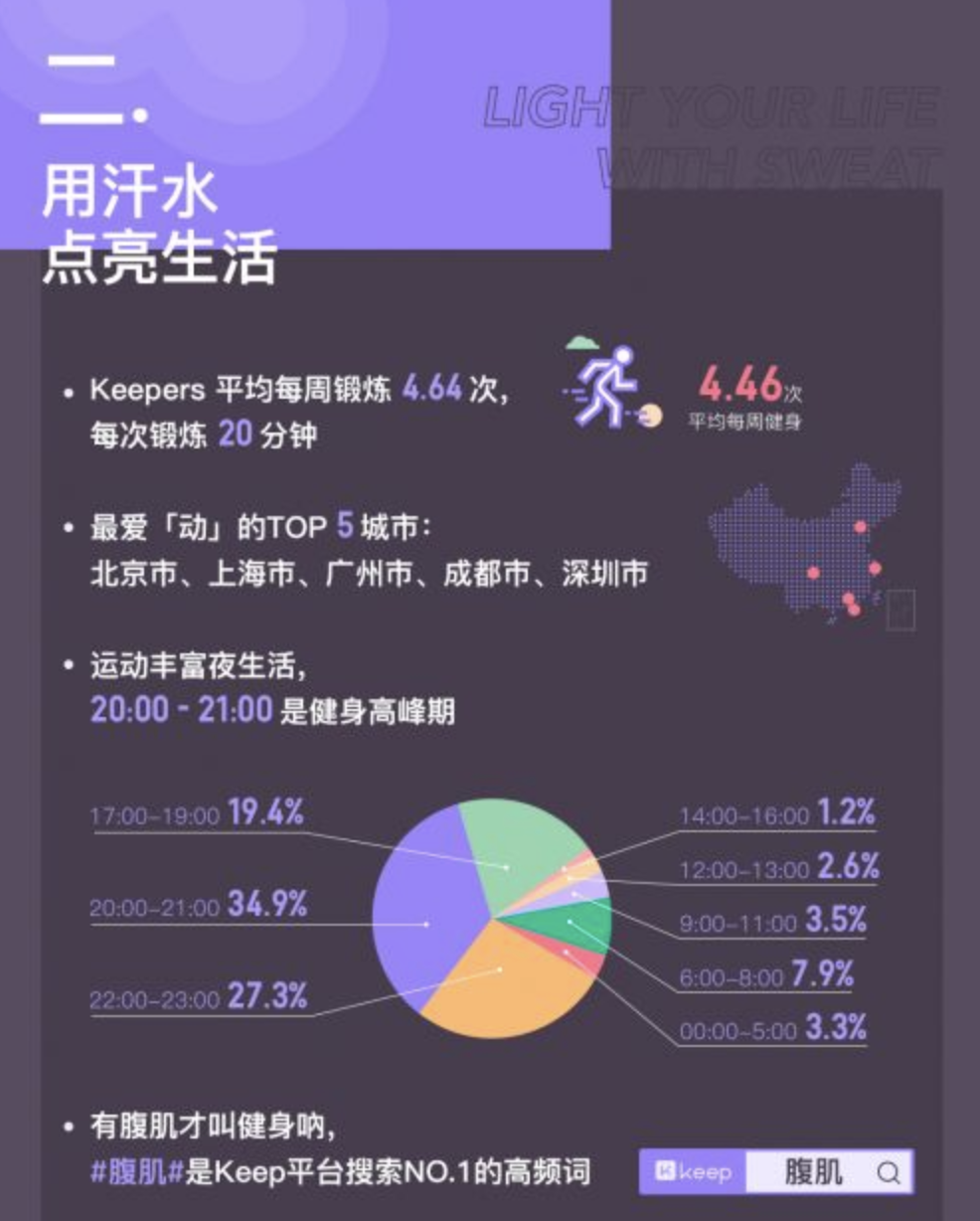 Keep在2020年1月份发布了《国民运动生活大赏》数据报告,keep是有社交属性的运动健身平台,在平台上活跃这2亿左右的用户,keep基于这2亿+的用户运动健身行为数据,基于了数据分析。