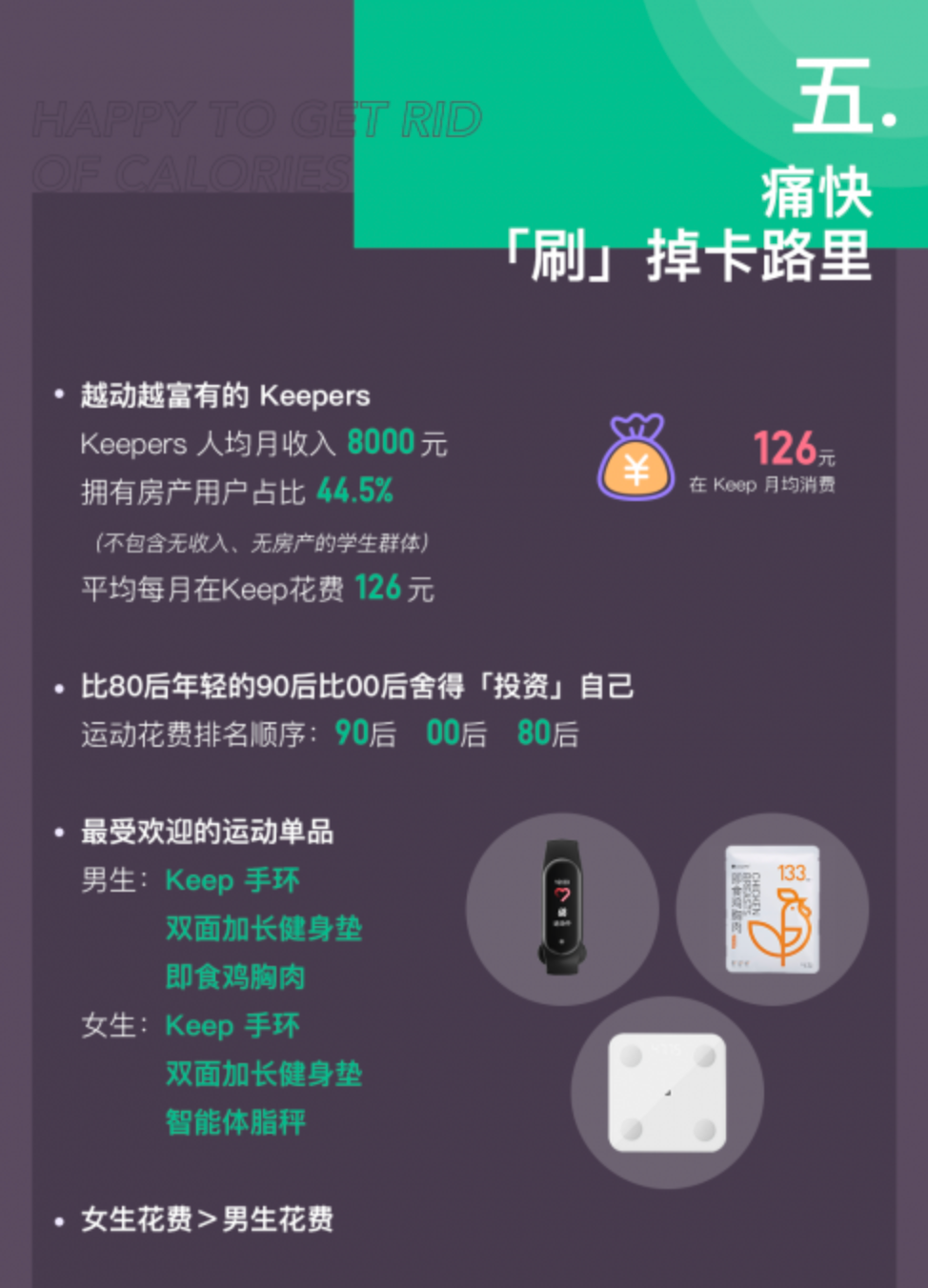 其中,keepers人均月收入在8000元左右,且拥有房产用户占比44.5%,说明keep的核心用户为城市的白领及以上,具有一定的消费能力;