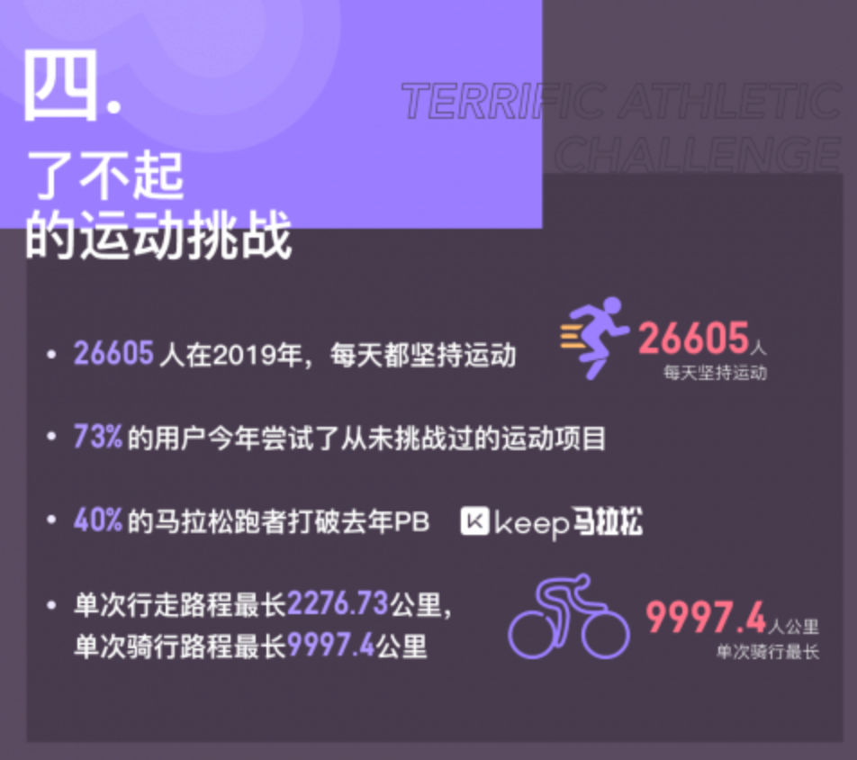 全年一共有26605人在keep上坚持每天运动;不断挑战自我也是一种精神,73%的用户在keep上挑战了keep的新课程和新的运动体验。