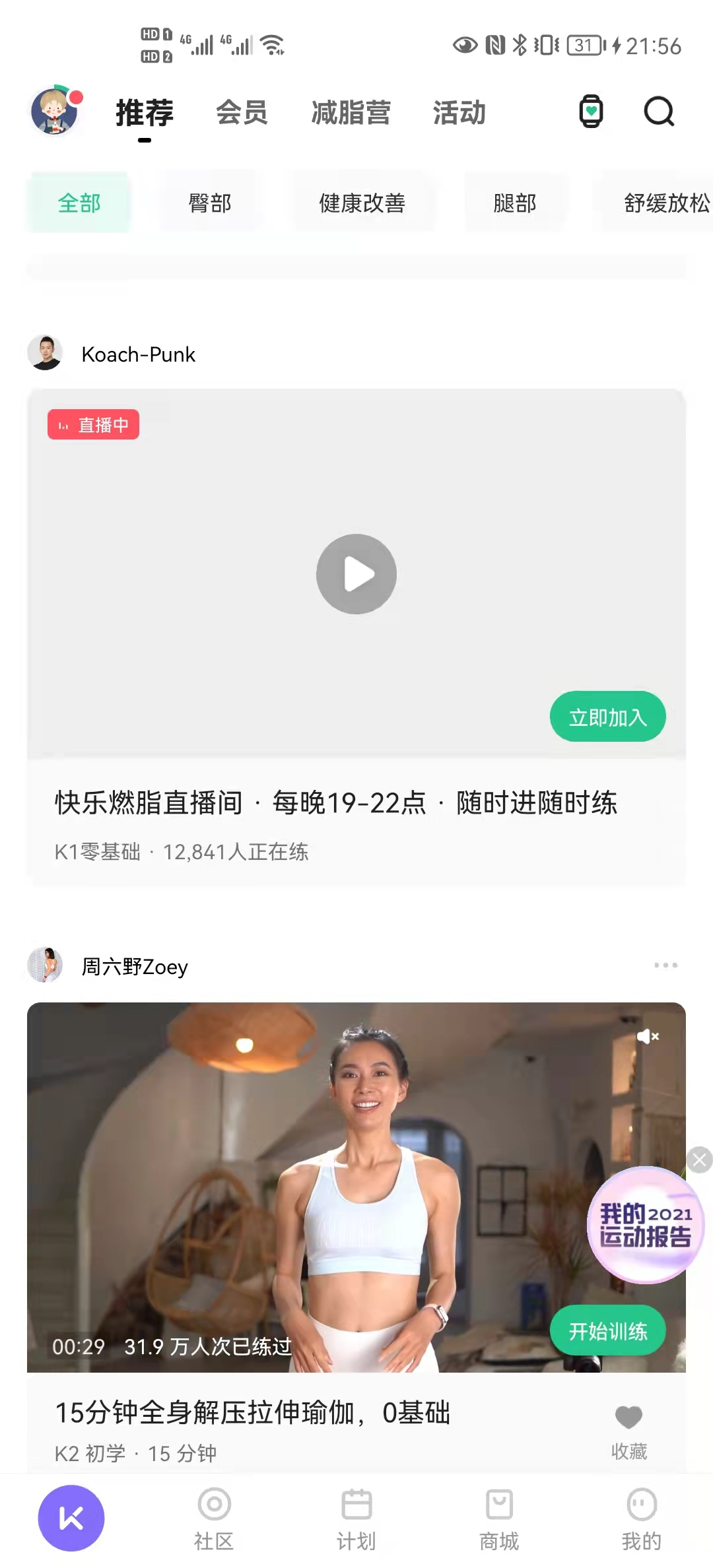 keep首页下面会推荐一些KOL健身教学视频和keep官方直播课,让用户直接连起来,增加用户活跃,当然在首页上keep也将最主要的健身功能加上,比如直播课,用户想要跟着直播课进行联系需要付费或者充值会员。