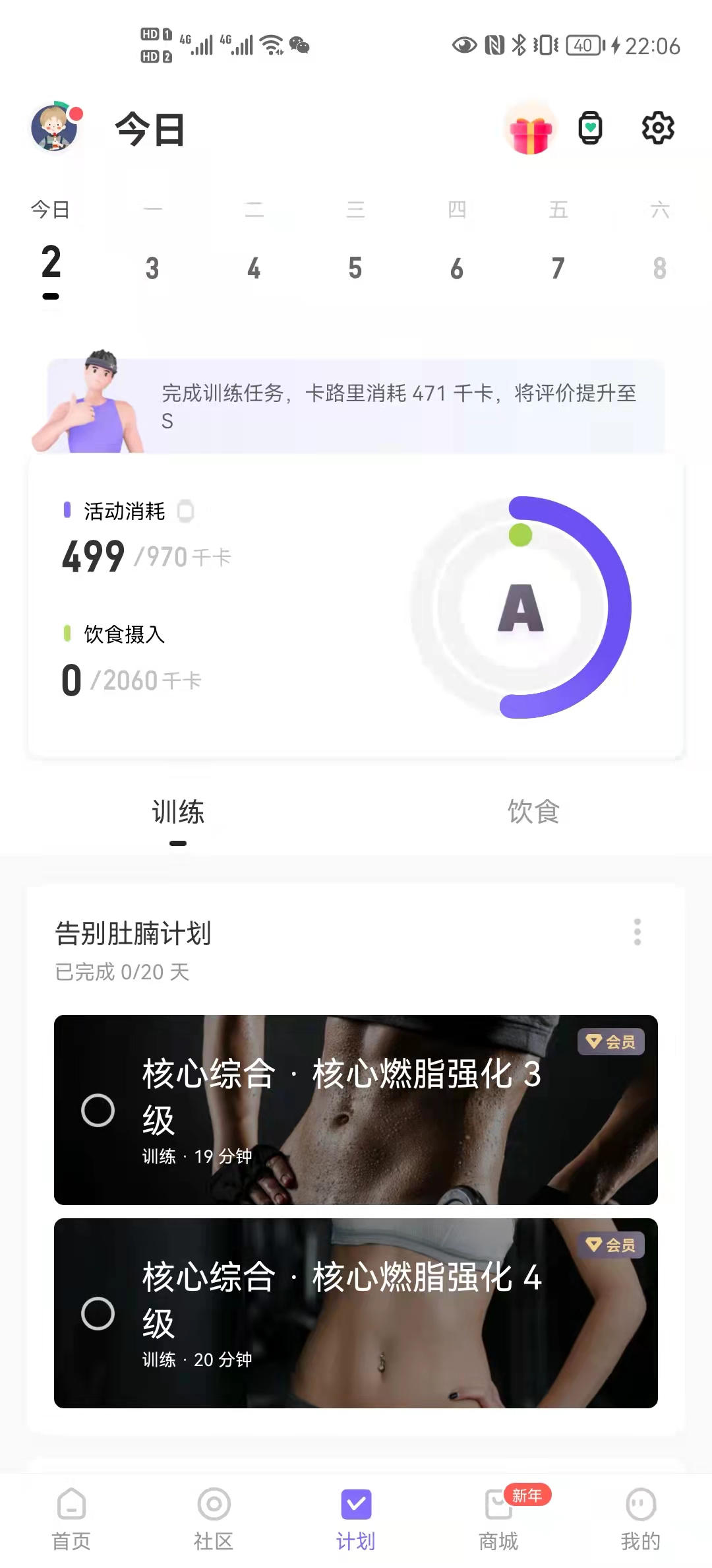 计划:在计划里,用户可以观看每日的活动消耗卡路里数据,及摄入数据,这里的相关数据需要充值vip会员才可以享有。里面还有更具用户的行为属性和运动标签,推荐出来的相关运动。做到精准推荐(可以吸引用户充值付费会员),其中有免费课程和付费课程。