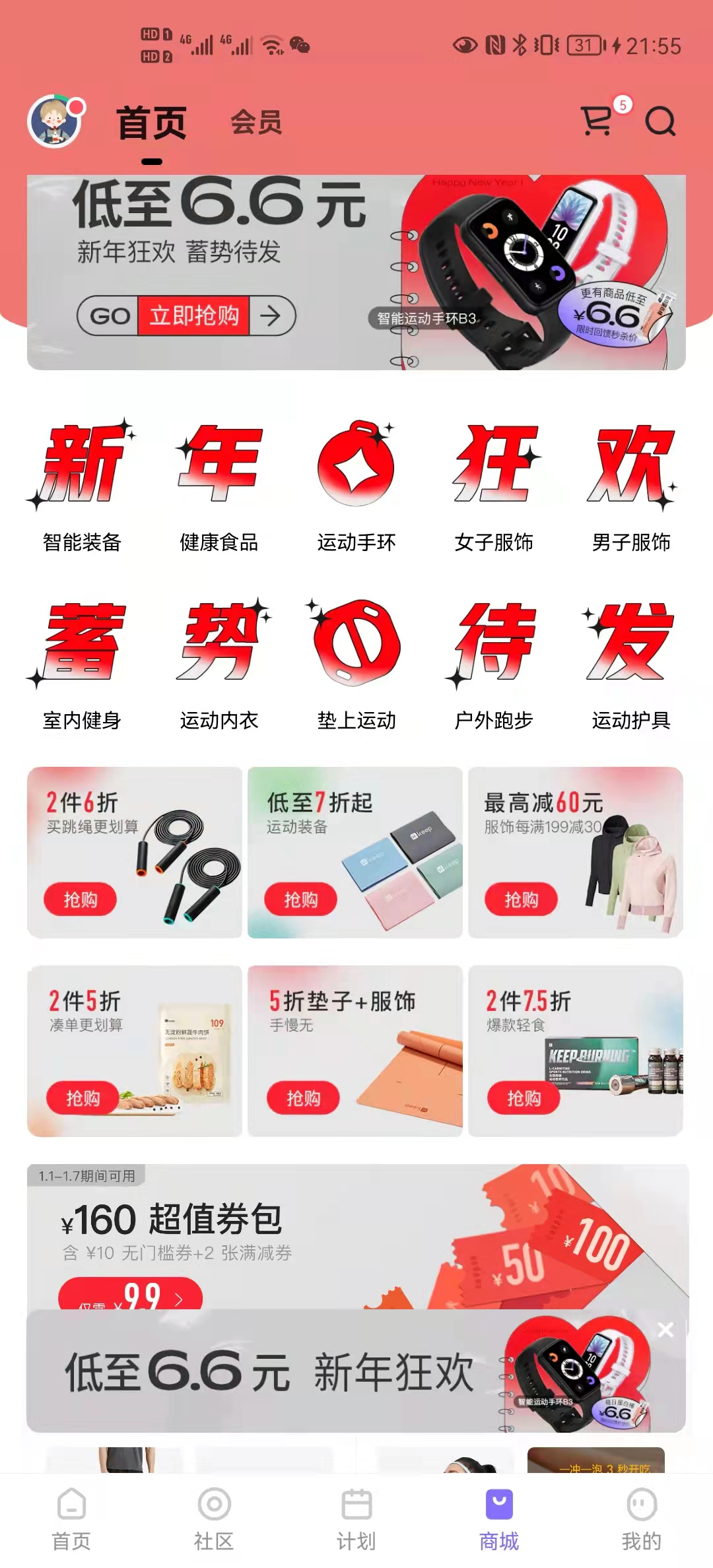 “商城”Tab功能 主要承载了keepers提供运动饮食食品、健身食品、健康餐食、装备、智能设备(是Keep产品变现的关键模块);