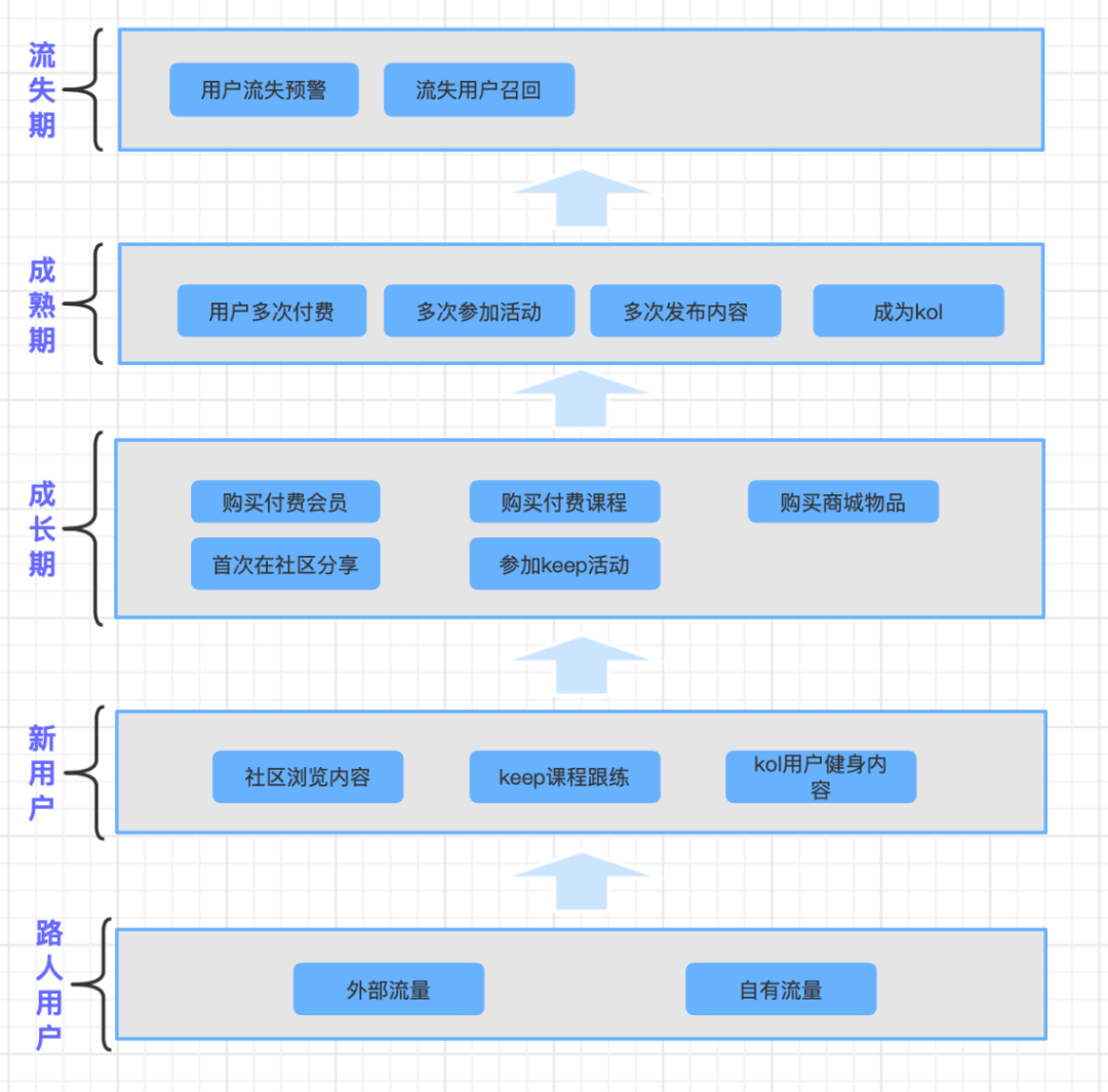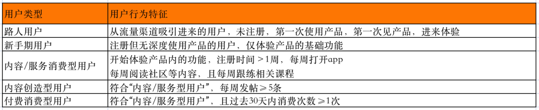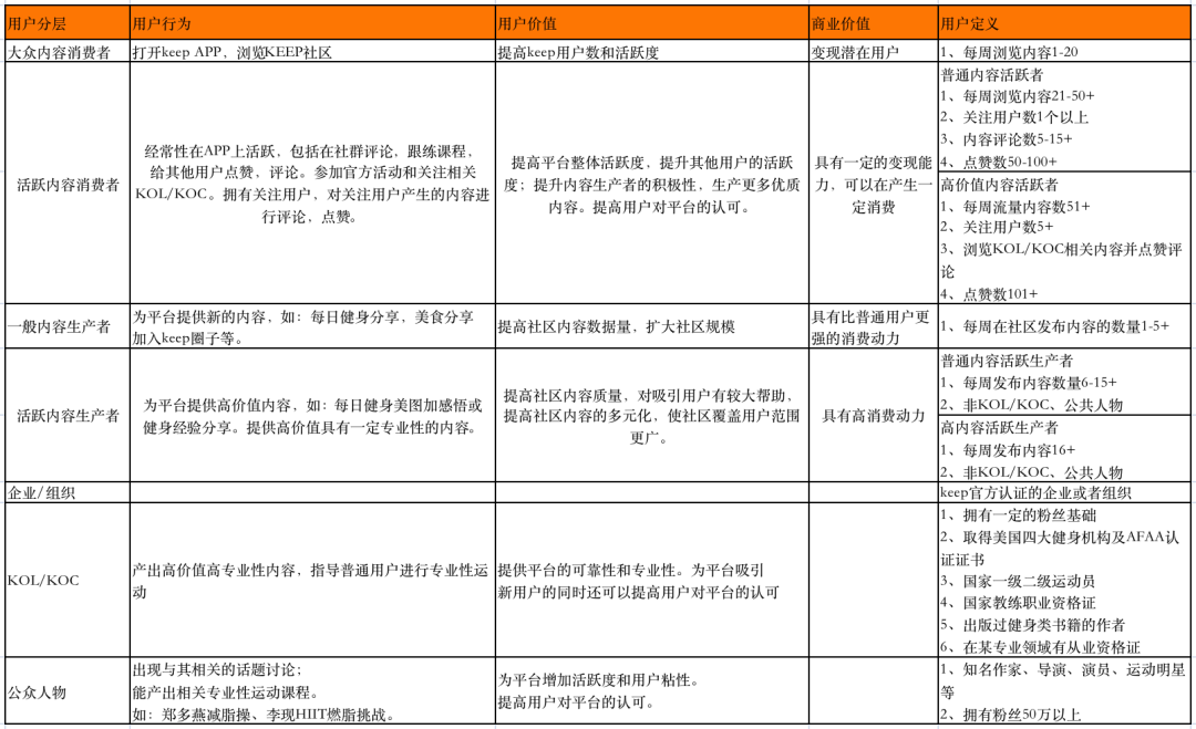 用户类型上看,可将Keep用户分为:路人用户、新手期用户、内容/服务消费型用户,内容创造型用户、消费购物型用户。同一个真实用户或会在产品中扮演多个产品用户角色。