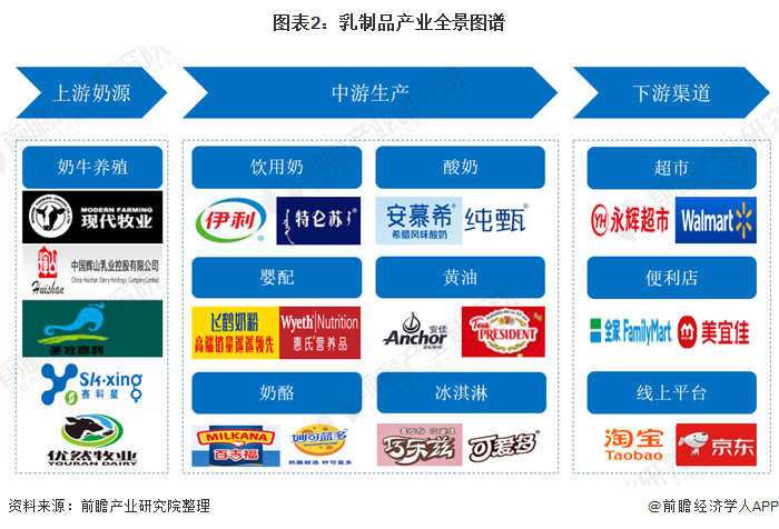 乳制品产业链涉及多个行业和企业,上游主要参与者有奶牛养殖企业现代牧业、乳山、圣牧、科兰、优然牧业等;中游乳制品生产重点企非主要有伊利、安慕希、飞扬等乳制品品牌;下游的重点流通渠道则包括沃尔玛、永辉等大型商超,全家、美宜家等便利店以及淘宝、京东等线上平台。