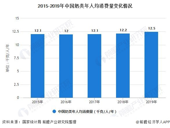 根据国家统计局《中国统计年鉴2020》的数据显示,2015-2019年我国奶类年人均消费量整体呈现波动上升的趋势。其中2019年我国奶类年人均消费量为12.5千克/人/年。奶类人均消费量整体维持在12-12.5千克/人/年左右,与世界平均水平相差较大。