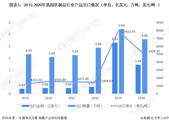 出口方面,受海外疫情总延、贸易内外价差等影响,根据海关总开数据显示,2020年全国乳制品出口合计4.60万吨,金额2.4亿美元,同比下降19.90%和46.81%。