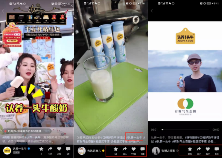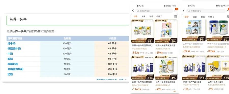 依靠营销模式使品牌“出圈”,短短几年时间,其抓住了内容自媒体、私域、直播几次风口,发展为全网粉丝超 2500 万,会员超 1190 万的新锐品牌。最初的私域流量积累销量,认养一头牛开始频繁出现在各大主播的直播间。例如认养一头牛的纯牛奶、酸奶、奶粉,都是薇娅直播间的常客。