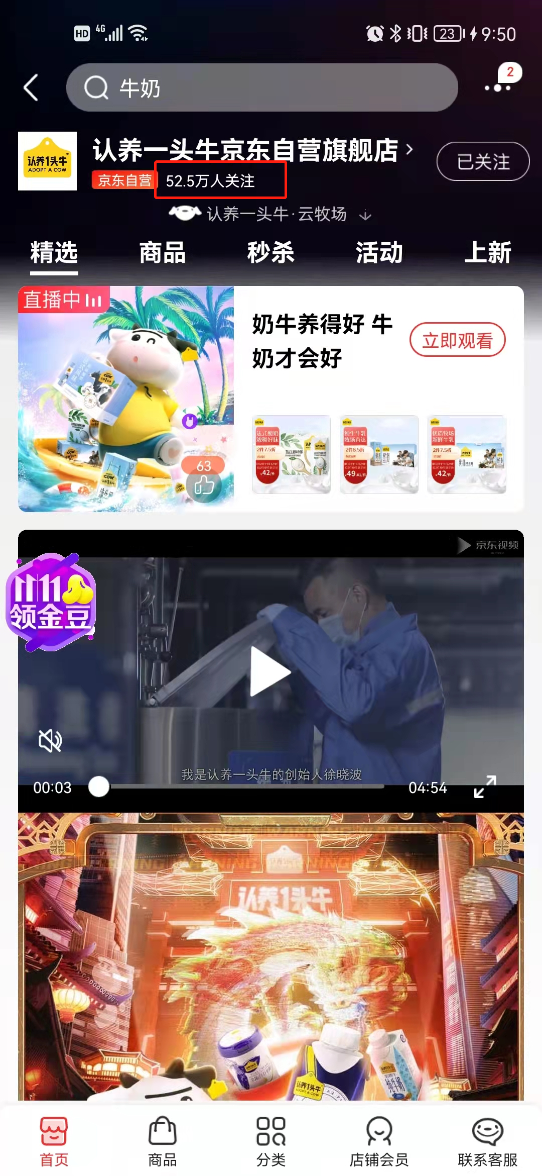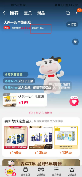 认养一头牛18年入驻淘宝,目前粉丝1176w,是所有渠道中粉丝量最多的,目前主要通过主播带货来进行销售