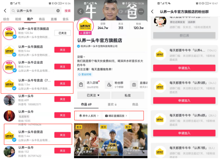 只有69个作品,分为两个系列,一个是养牛人系列,一个是直播精彩回放。其余为广告。抖音上有5个粉丝群,总人数374人。加群的人数并不多,群的运营认养一头牛还没做起来。