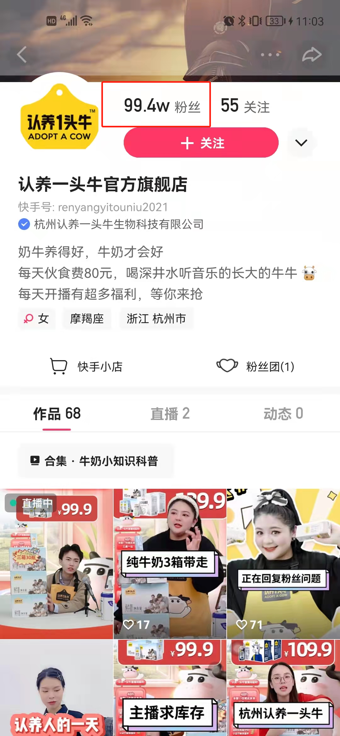 认养一头牛快手店铺11月21日粉丝量为98.8w,截止11月22日晚11点粉丝量为99.4w,一天之内增长0.6w粉。目前共68个作品,主要系列为牛奶小知识。