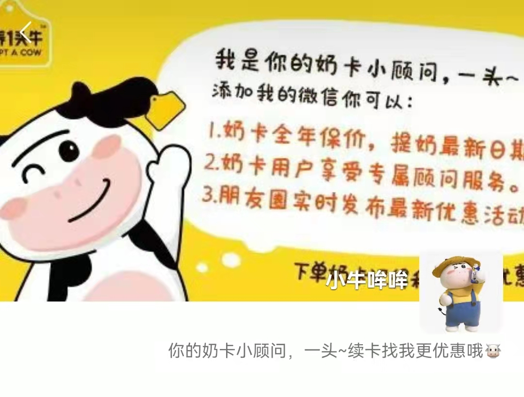 因此,大部分用户都是通过奶卡添加到私域。用户添加后,奶卡顾问也会在第一时间提供用奶指导和开卡指南。奶卡相对会更便宜些,自己之前买过他家的酸奶,小200块两踢,奶卡398元6提,送货上门,日期也更新鲜。