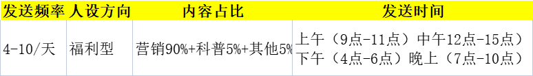 2)朋友圈90%内容都是营销性质,过于单一,建议再丰富一下,让品牌人物形象更加丰富立体。朋友圈的内容可以调整为生活圈(10%)、价值观圈(10%)、产品圈(70%),成果圈(10%)