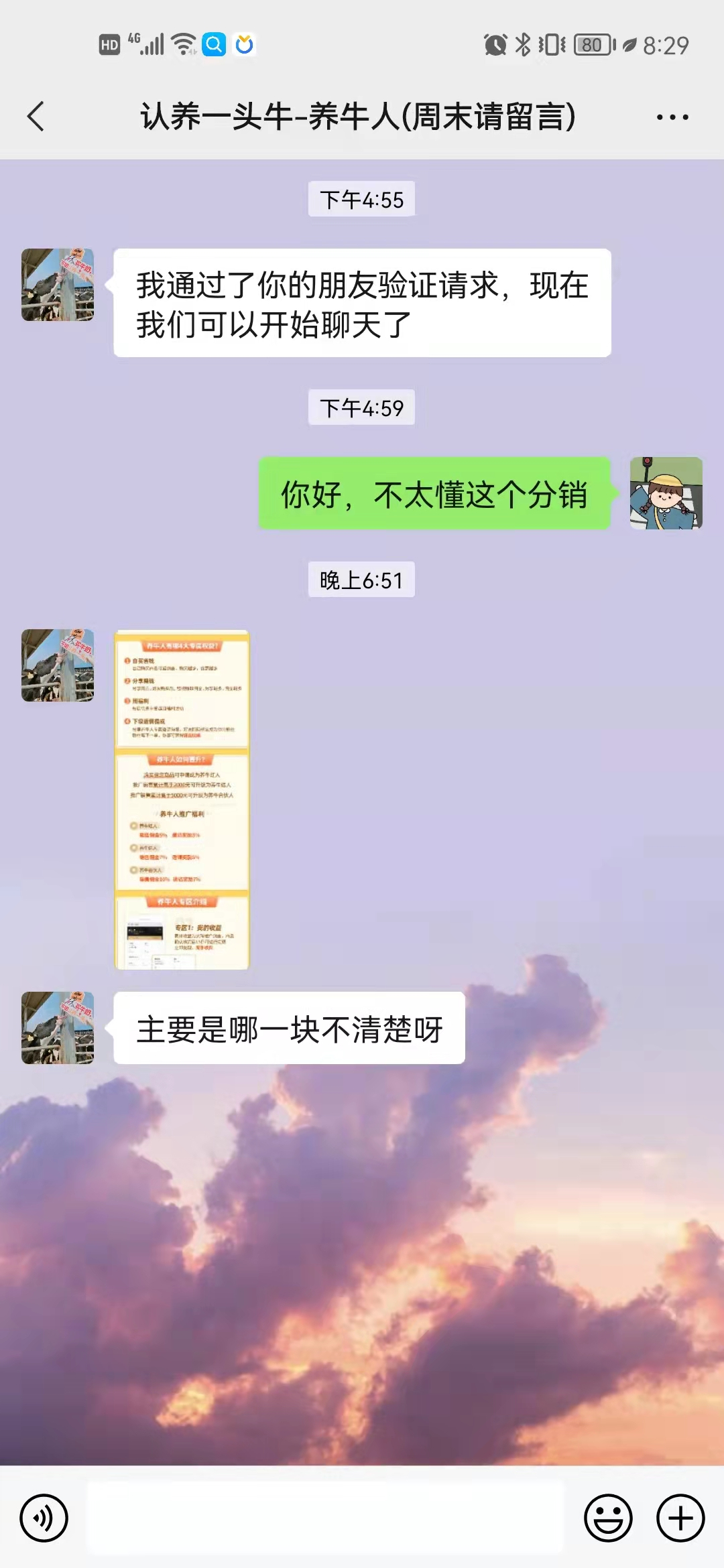 1)认养一头牛-养牛人微信背景建议换成成为分销员的具体步骤或是养牛人能帮助分销员做什么,来加强人设打造。
