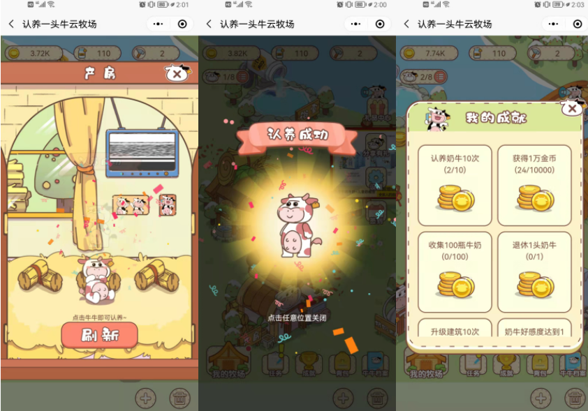通过认养奶牛,奶牛经过食堂、浴室、牛舍可以培育出牛奶、拥有足够的牛奶后可以在兑换中心进行兑换