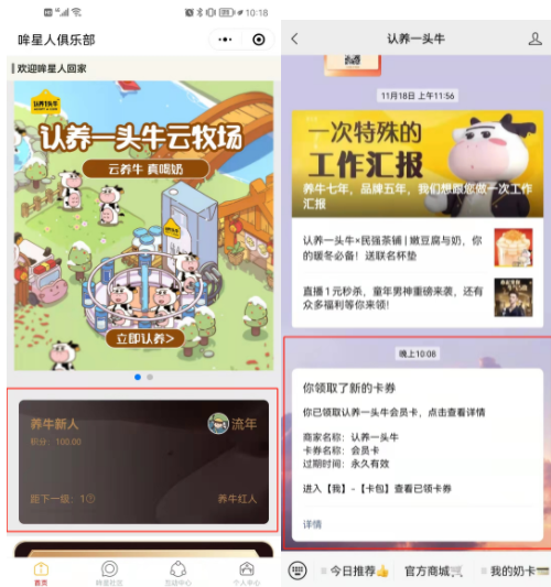 通过公众号认养一头牛和小程序【认养一头牛订奶卡】,进行会员引流。