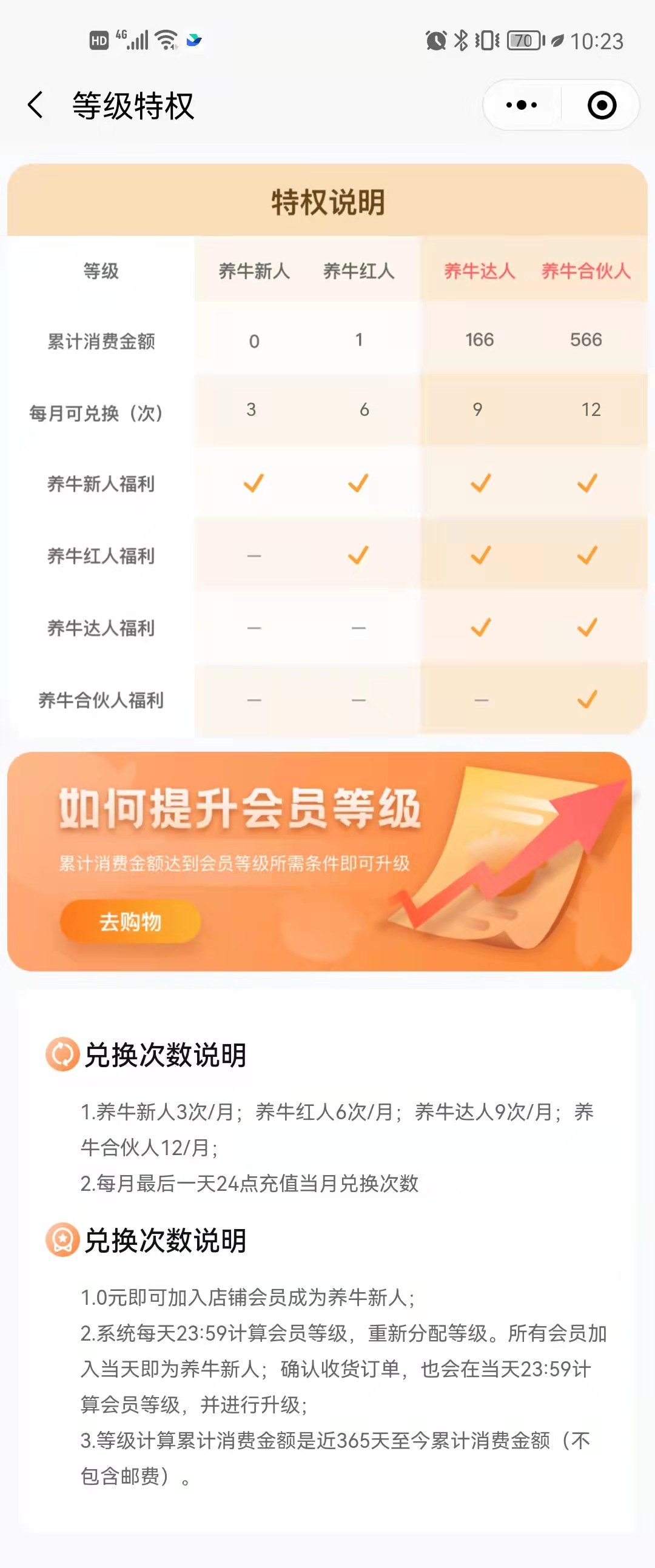 目前认养一头牛共有4个会员等级,按照用户在认养一头牛旗舰店上累计消费金额的总量进行升级,每层会员都会享受不同的权益和服务。