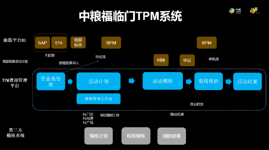 实际上,两个核心功能是相互作用的,因为促销活动一旦建立,就会占用预算。这种联动的方式,在中粮油脂营销整个TPM费用管理链条都有所体现。比如宋世武介绍的,这个TPM系统跟其他友商系统不太一样的亮点之一,是有稽核平台。这个稽核平台和预算、计划各个环节密不可分。因为促销活动大部分集中在门店,将每个活动关联到门店,会有地址、铺货情况等主数据,通过系统关联管理,活动一旦被批准,就能在稽核工作台上显示相应数据信息。对接BPM流程审批,稽核方案创建成功后,会通过接口自动发布至第三方爱零工平台,进行稽核执行,门店一旦被稽核选中,即不能核销,需要等稽核结果回传到TPM平台上,稽核任务才算结束。这里还有比较特别的一点是,稽核对象的选择是基于算法自动挑选的。