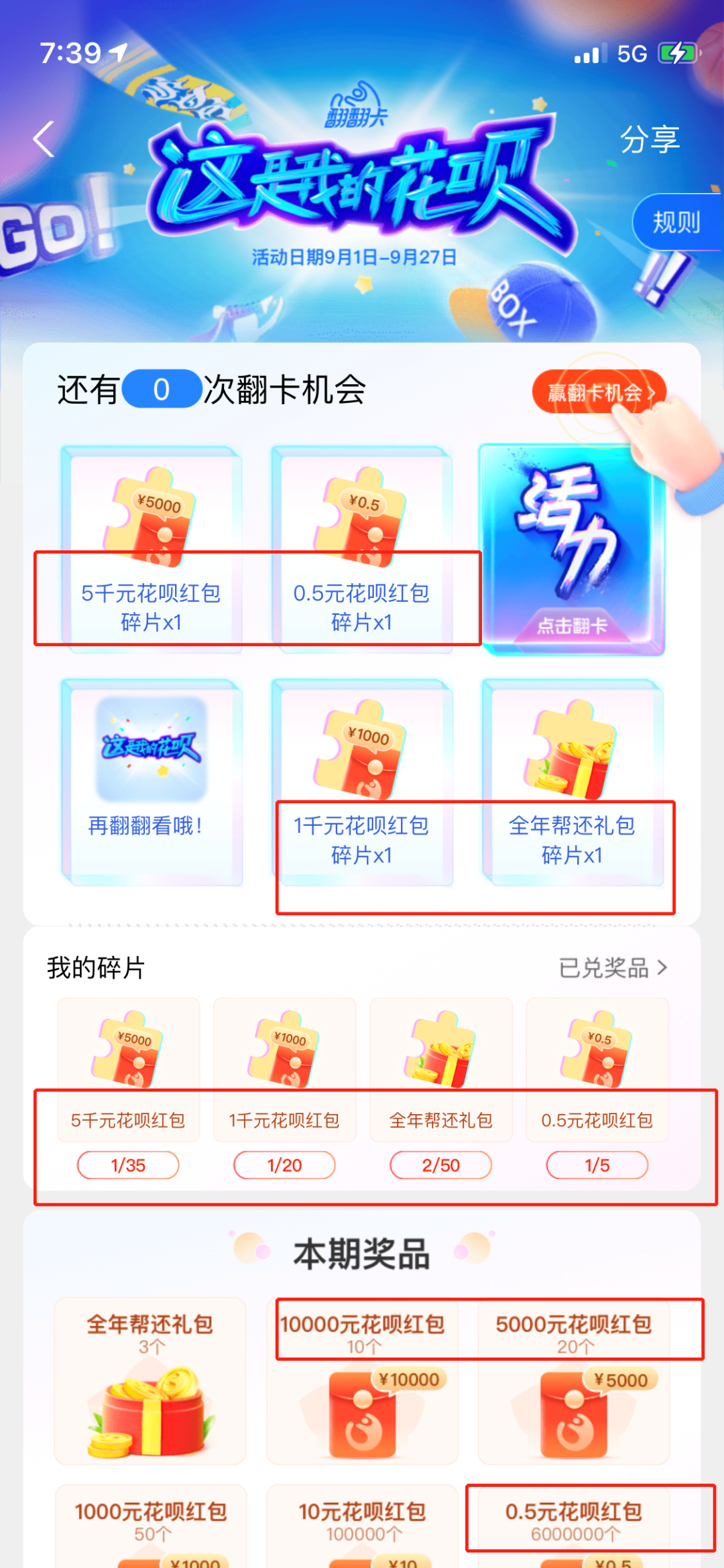奖品有花呗红包、花呗金、立减红包、公交券、火车票优惠券、饿了么红包、天猫超市满减券、考拉优惠券、飞猪红包,如果用户完全没有了解花呗红包与花呗金的介绍下,这样设置奖品造成疑惑,而且在翻翻卡活动中没有说明花呗红包用途,降低用户体验感。