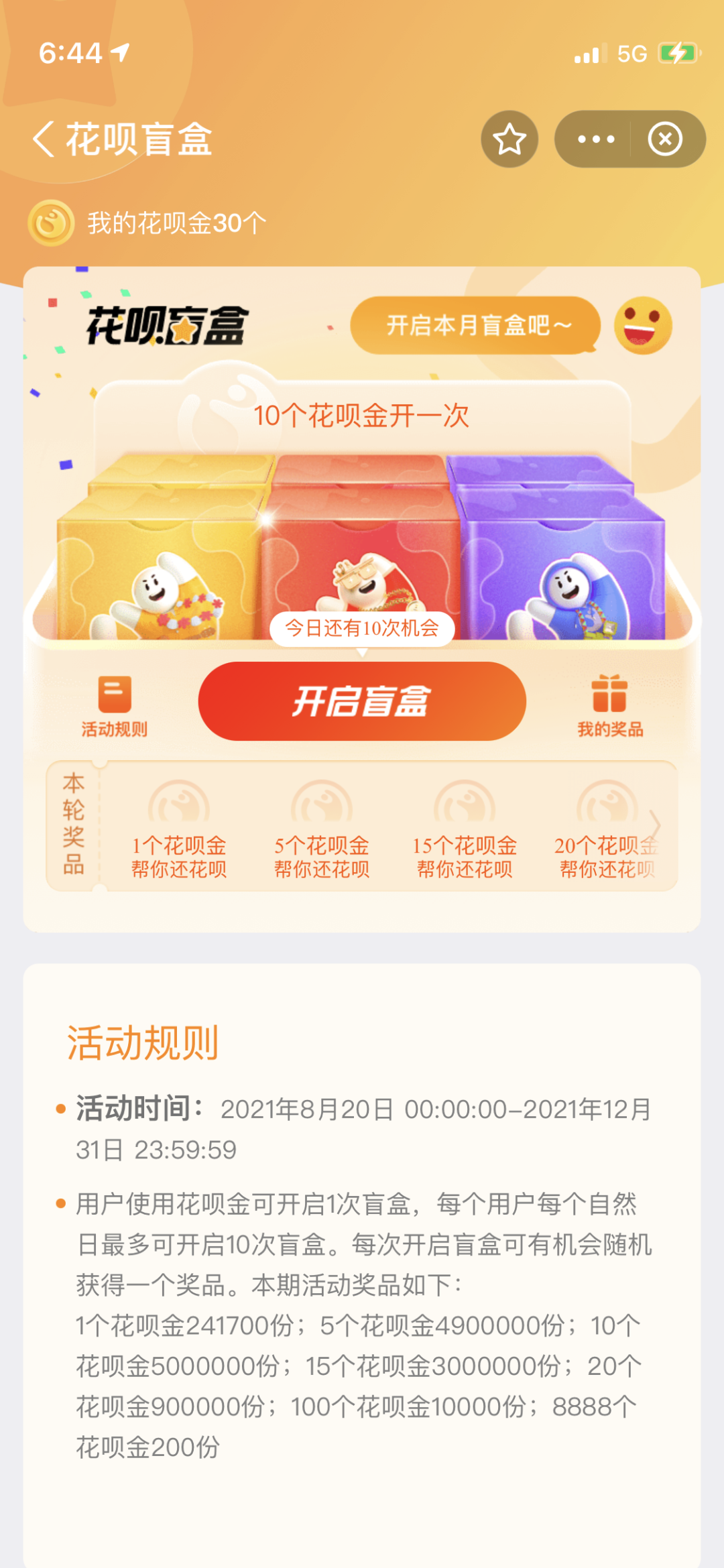 用户使用10个花呗金可以开一次盲盒,每天最多只可以开10次。