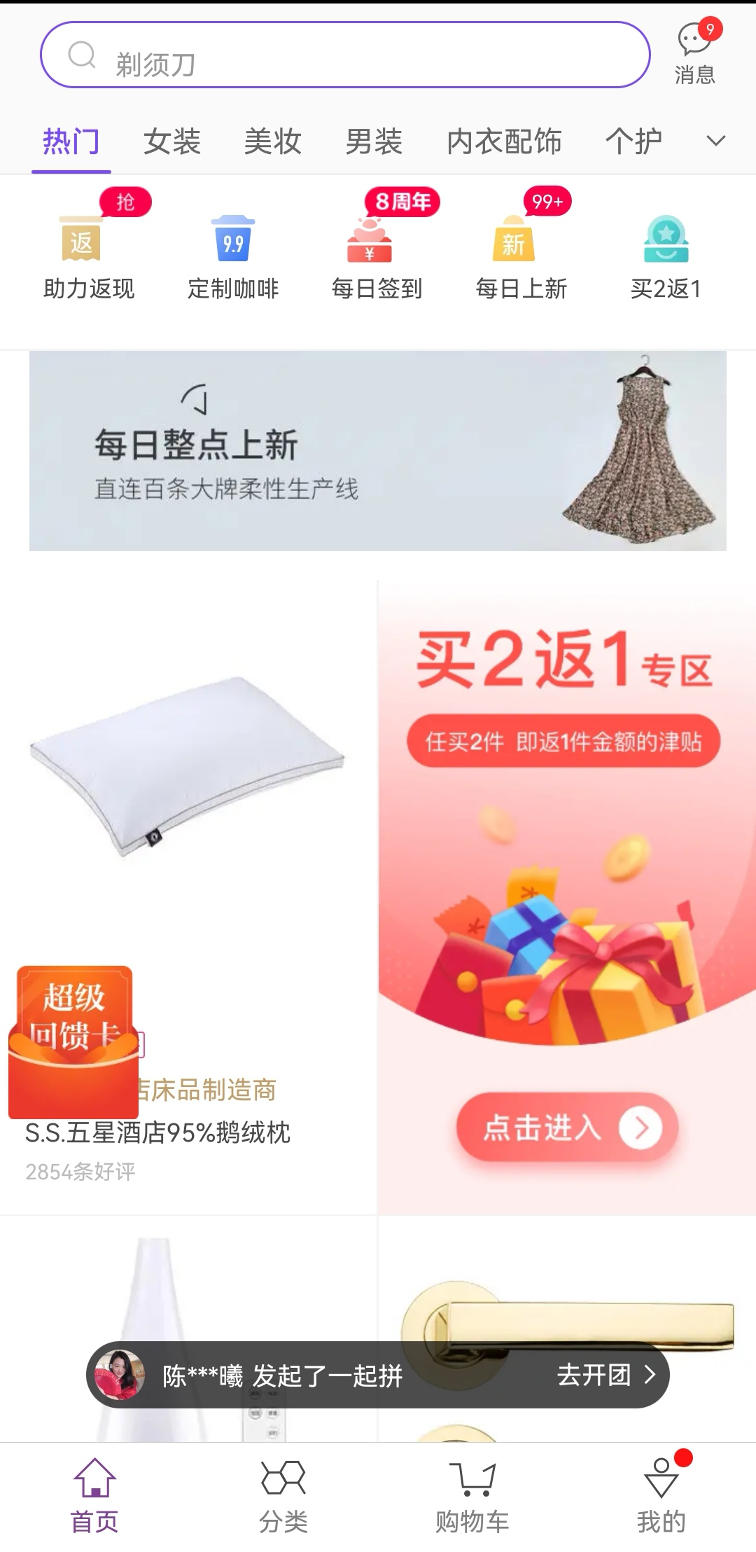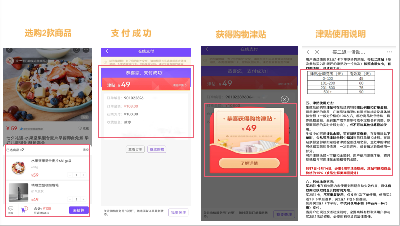 7)付费成功后,出现弹窗“恭喜获得购物津贴**元”,增强用户占便宜的成就感,为继续购物埋下伏笔。亮点3:活动两次弹窗设计