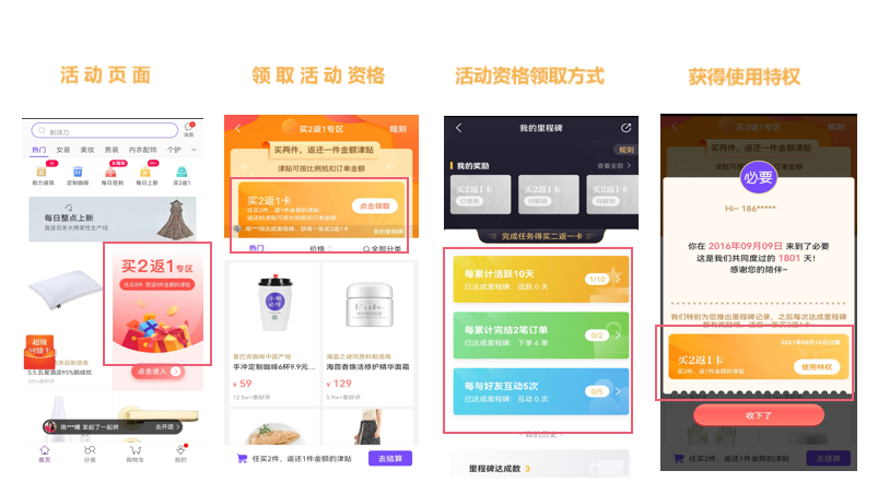 2)活动专区,滚动提示“**达成里程碑,获得一张买2返1卡”,利用从众心理,制造紧迫感,让用户产生“这么多人已经获得,我也要赶快参与”的想法。3)老用户收到弹窗,“Hi, 186***”、“你在2016年9月9日来到必要,这是我们共同度过的1801天,感谢您的陪伴”、“送您一张买2返1卡”,亲切的问候,用心的记录,精心的礼物,充分给用户被尊重的好感。