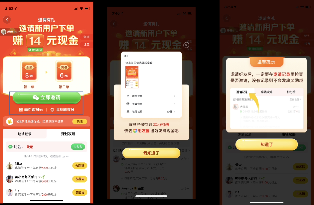 活动设定新户在有限时间内完成注册并下首单,邀请人即可获得8元奖励,直接微信到账,被邀请人在指定时间再次下单,邀请人再次可获得6元;