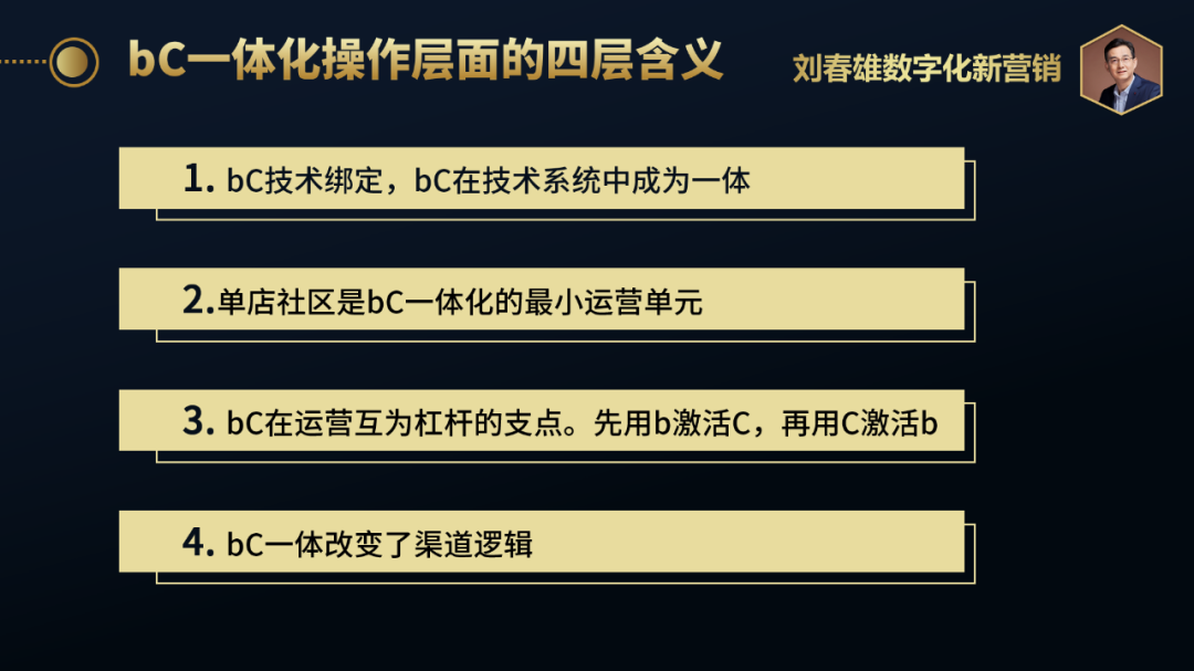 渠道数字化体系之下,bC一体化在操作层面体现在四个方面:1、bC技术绑定,bC在技术系统中成为一体;2、单店社区是bC一体化的最小运营单元;3、bC在运营互为杠杆的支点。先用b激活C,再用C激活b;4、bC一体改变了渠道逻辑。
