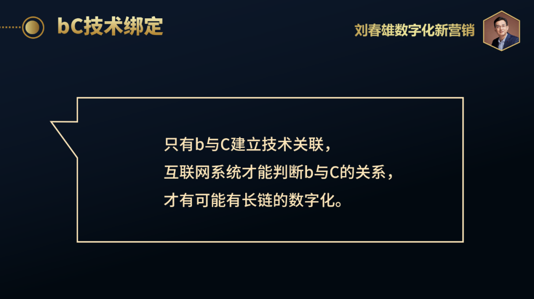 bC一体化,首先要实现bC技术绑定,数字化系统认可的关系是技术关系。比如,两个很好的朋友,只是线下常见面,没有微信、钉钉、微博、小程序等各类互联网社交平台上建立技术联系,系统不会在技术自动认可两人的社交关系。