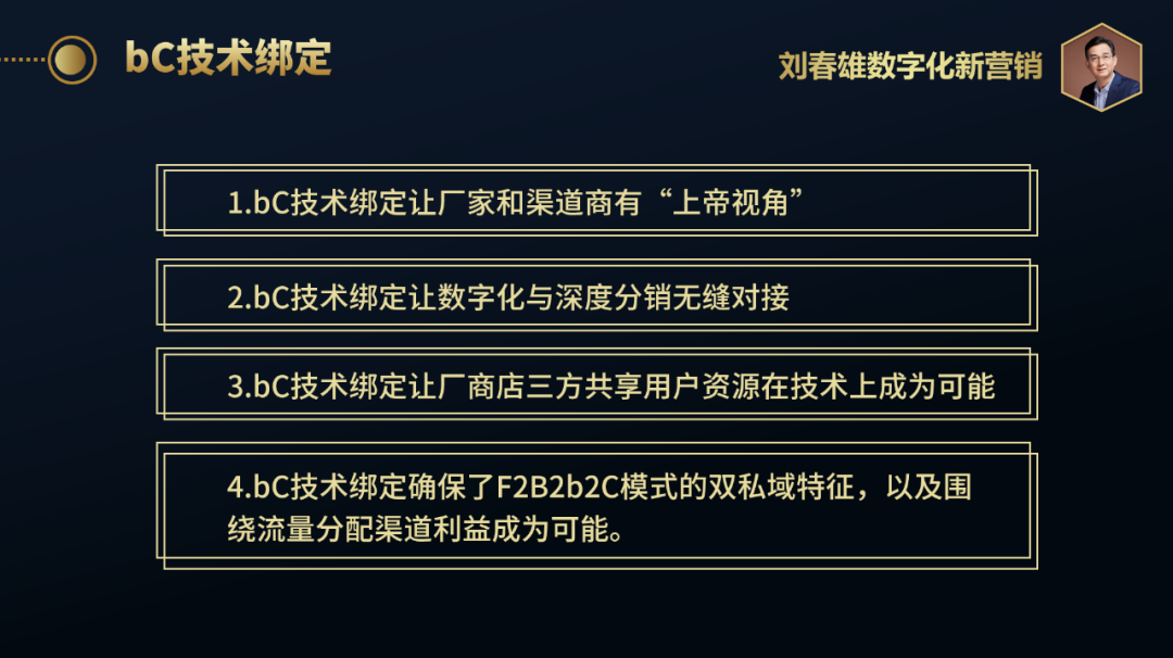 第四,bC技术绑定确保了F2B2b2C模式的双私域特征,以及围绕流量分配渠道利益成为可能。以流量分配渠道利益,这是F2B2b2C区别与其它数字化模式的重要特征。bC技术绑定使利益分配可以在后台自动完成。