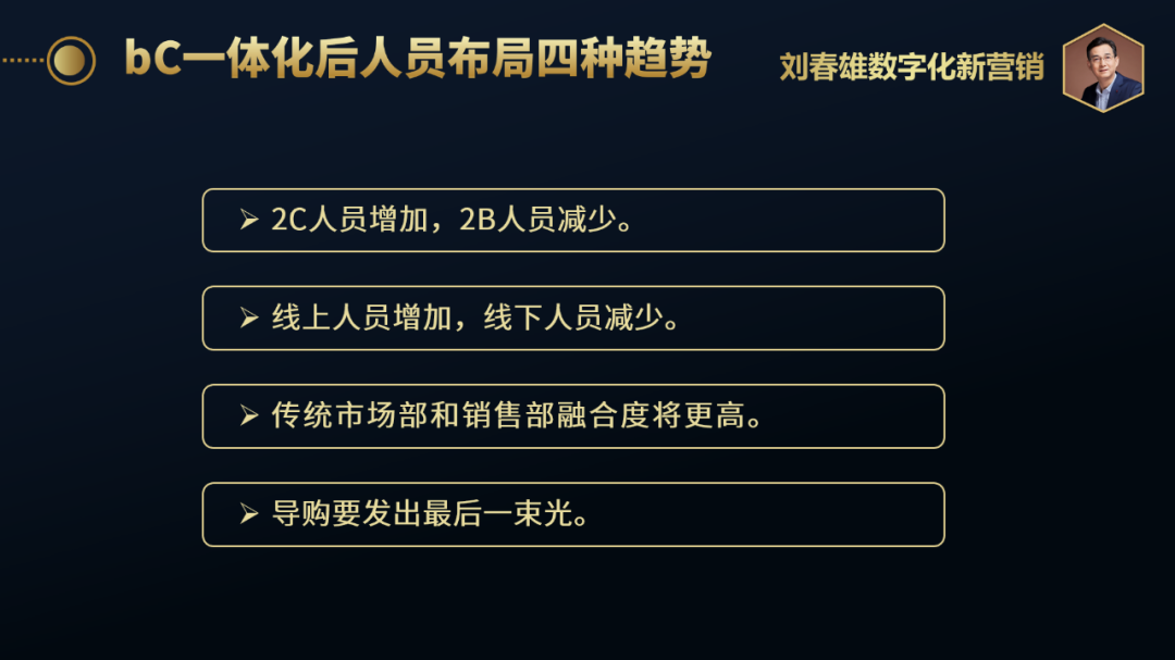 第三,传统市场部和销售部融合度将更高。市场部转型为数字化中台,而且线上线下融合,区域性中台与区域性线下部门的融合度更高。