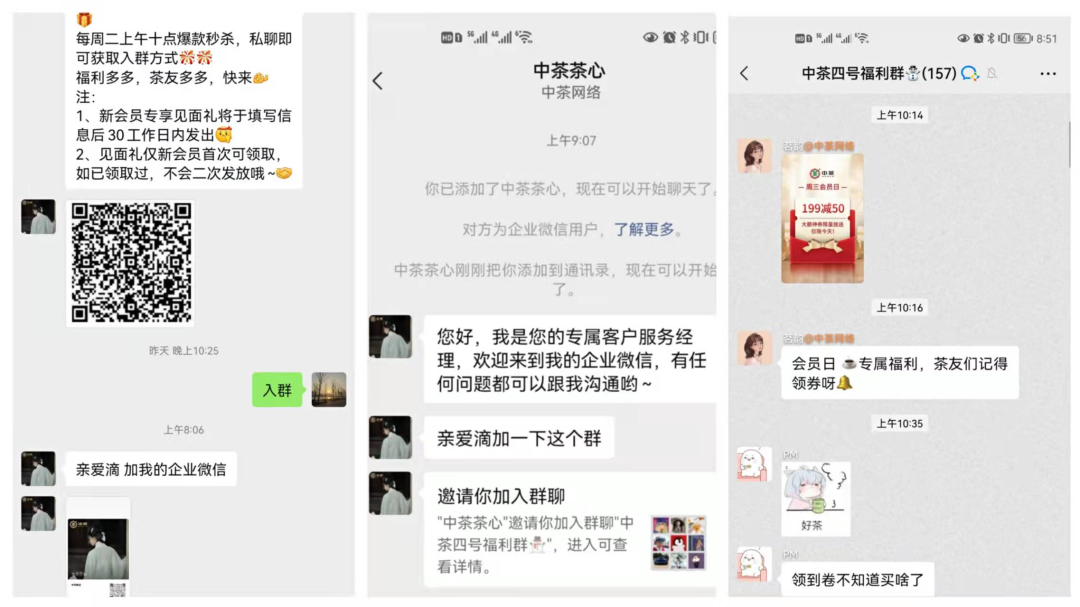 最近在做茶叶相关项目,加上对包裹卡比较有兴趣,所以选择了中茶来进行拆解,但是在体验过程中发现中茶的私域还处于搭建初期,私域运营链路不清晰,没有分层精细化运营,私域场也未形成闭环,其实并没有太多拆解价值。