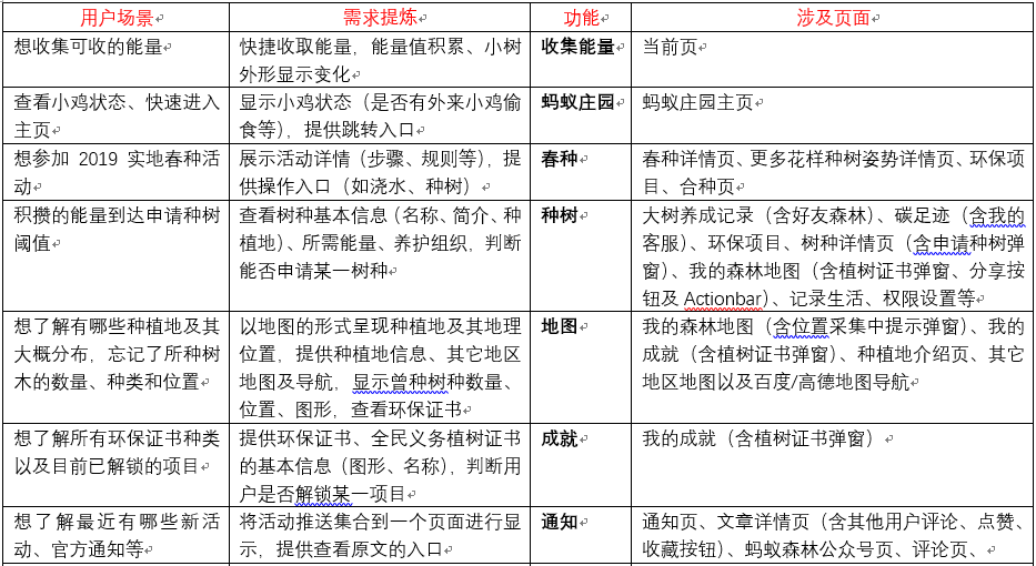 为了植树造林、减少全国沙化土地面积、改善沙化地区人民生活状况和当地经济效益;也为了鼓励广大用户绿色出行/办公/生活、扩大移动支付应用场景、培养用户使用习惯和提高用户黏性(产品目标))支付宝推出了一项名为“蚂蚁森林”的公益活动性质的功能,用户通过步行、在线缴纳水电煤气电话费、网络购票等行为收集能量,实现虚拟树木的养成,最后在公益组织、环保企业等的组织下,在某荒漠化地区栽种一棵真实的树。