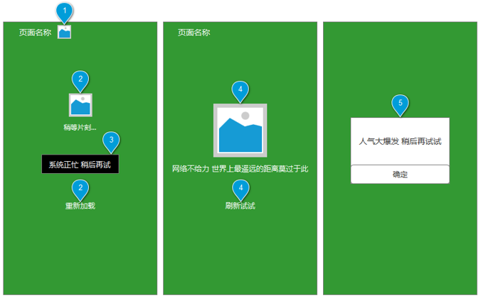 - 页面中上部显示“稍等片刻……”文本、蚂蚁森林图标缓冲动画(根据当前页面选择文本颜色,为蓝底、绿底时文本呈白色,为白底时文本呈绿色)(点击地图)、隔3s左右显示“重新加载”链接;(点击好友森林)
