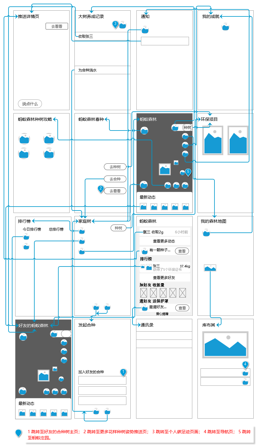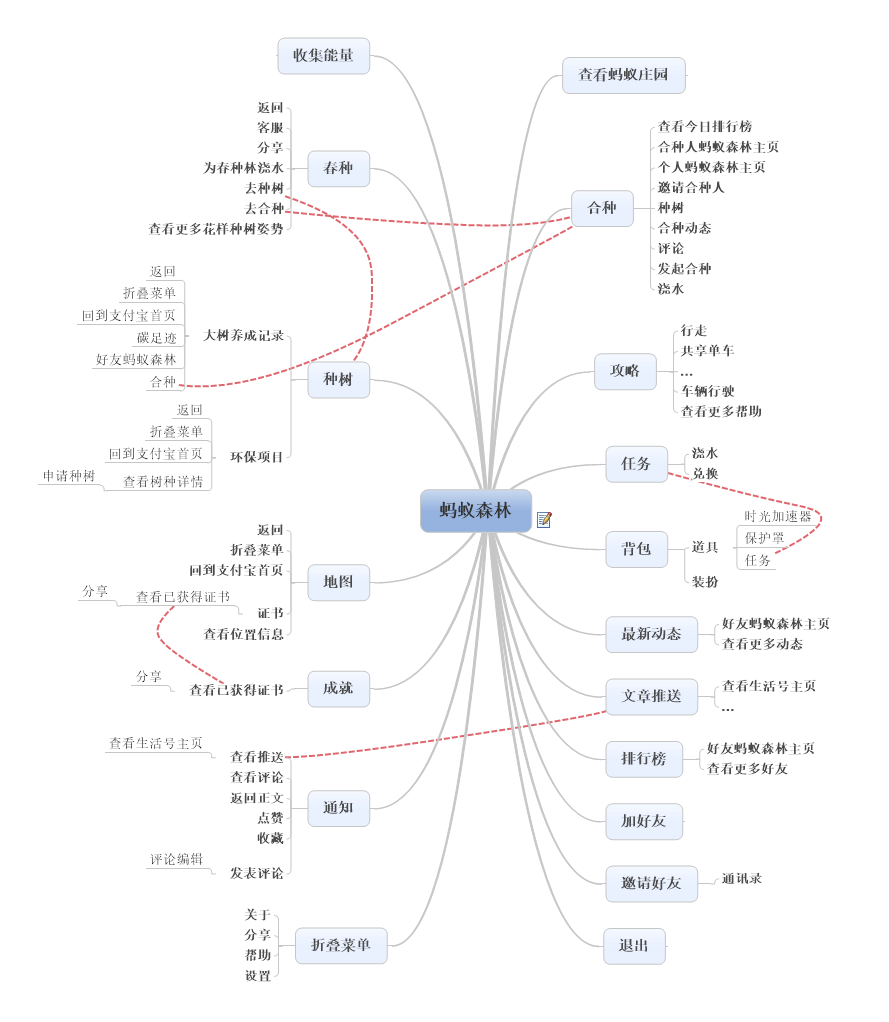 蚂蚁森林的所有功能及分别涉及的页面见需求分析部分,下面以图的形式展示功能的结构和功能之间的关联关系(红色虚线表示)。