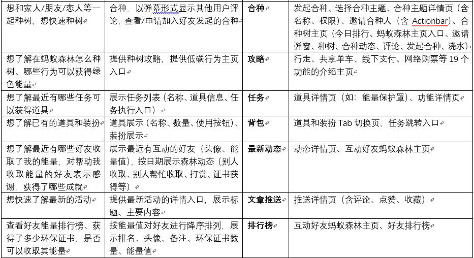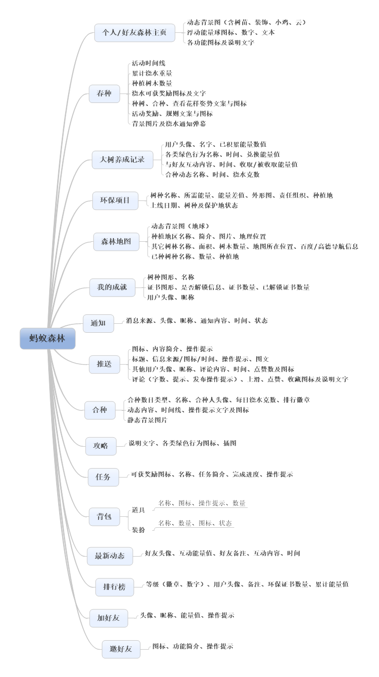 笔者参考了一些人人上已有的倒推文档,结合自己的思考,倒推了支付宝内蚂蚁森林模块的PRD。麻雀虽小,五脏俱全,虽然蚂蚁森林只是支付宝众多内部功能模块之一、在首页上也只占据了小小的一块面积,但它的需求分析、逻辑阐述、信息界面等的设计都是需要精雕细琢、反复优化的。