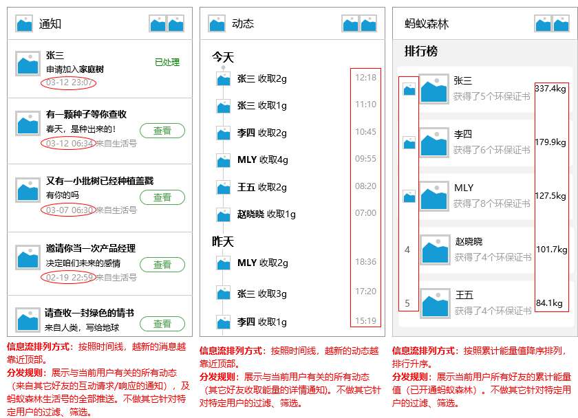 “通知”、“最新动态”、“排行榜”三处的信息流分发逻辑设计如下: