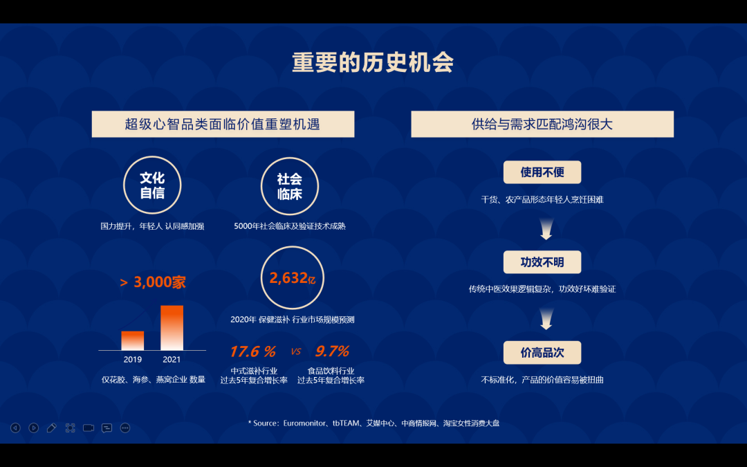 需要注意的是,滋补品类不像其他的很多超级品类或者刚需品类,它没有多年沉淀下来的使用场景,它的使用场景已经改变了。因此,不找到用户的需求就解决不了问题。