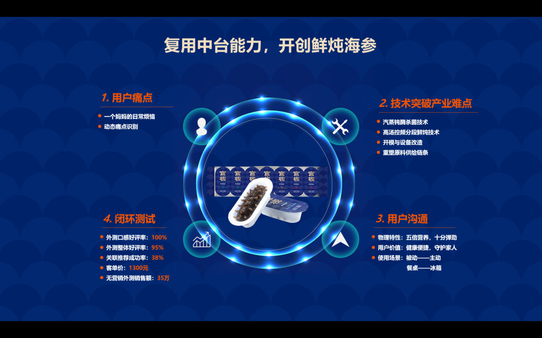 因此,我们创造了痛点识别体系,发现这个品类除了不便捷以外,还有很多其他痛点。于是我们启动了研发中台,基于鲜炖稳定技术和花胶稳定技术,对海参进行热杀菌,从而开创出能够冷藏的鲜炖海参,从冰箱拿出来撕开就可以立即食用。
